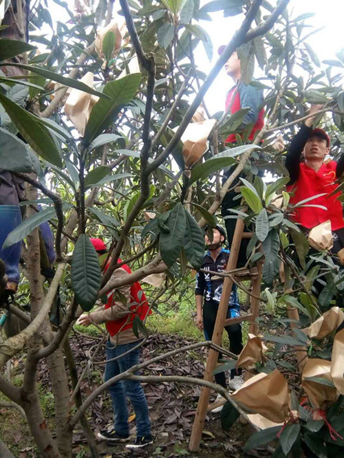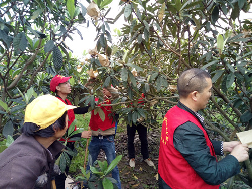 徐**家种植了几亩枇杷,义工们向他学习了枇杷筛选的注意事项,一起帮忙筛选枇杷,用纸袋子把一个个枇杷套起来。