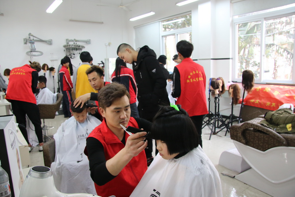 义剪服务队的义工们拿着简单的理发工具,从下午13点持续到17点,为近百个学生理了发。在理发师的精心修剪下,新的发型让学生们精神焕发,学生相互打量着,满心喜悦。