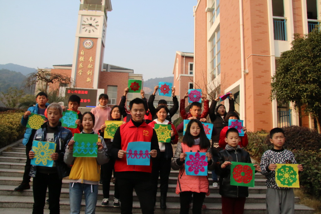 剪纸活动中,义工们对现场的学生进行指导,大家热情高涨,积极配合。他们在了解剪窗花的步骤和方法后,认真地折叠、精心地设计。在小心翼翼的剪裁后,轻轻地一层一层地展开。当彩纸在同学们手中变成一件件艺术品时,大家都笑得合不拢嘴儿。