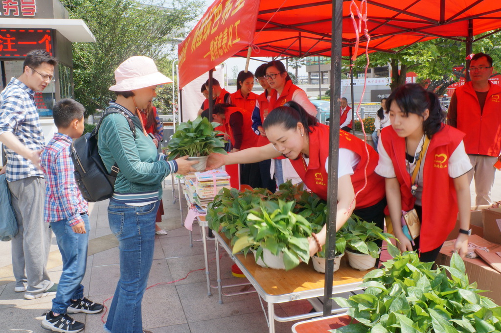 活动现场摆满了“绿萝”、“多肉”、“含羞草”等盆栽,市民们可用废旧书籍到现场兑换。一大早,市民就排好队等候在了现场,义工们穿梭在每个岗位耐心的服务着来兑换植物的每一位市民。